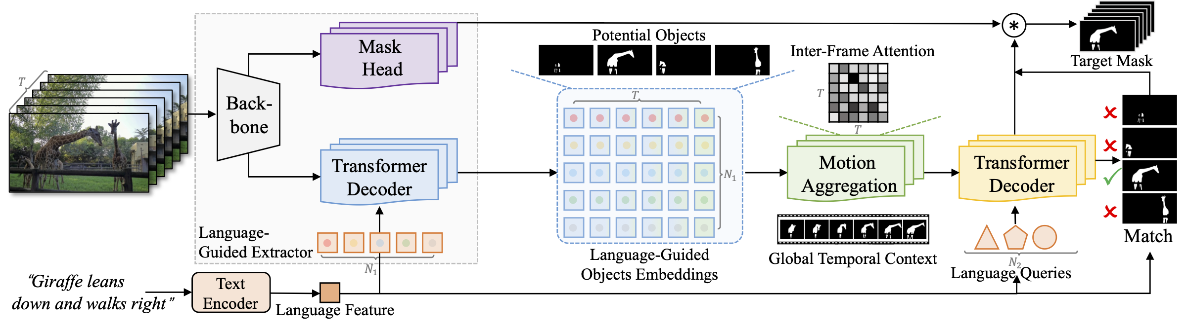 Figure 2. The overview architecture of the proposed baseline approach Language-guided Motion Perception and Matching (LMPM). We first detect all possible target objects in each frame of the video and use object embeddings to represent them through Language-Guided Extractor. Then, Motion Perception is conducted on all the object embeddings of the video to grasp the global temporal context. By leveraging language queries and object embeddings with motion information, we generate object trajectories through a Transformer Decoder. Finally, we match the language features with the predicted object trajectories to identify the target object(s).