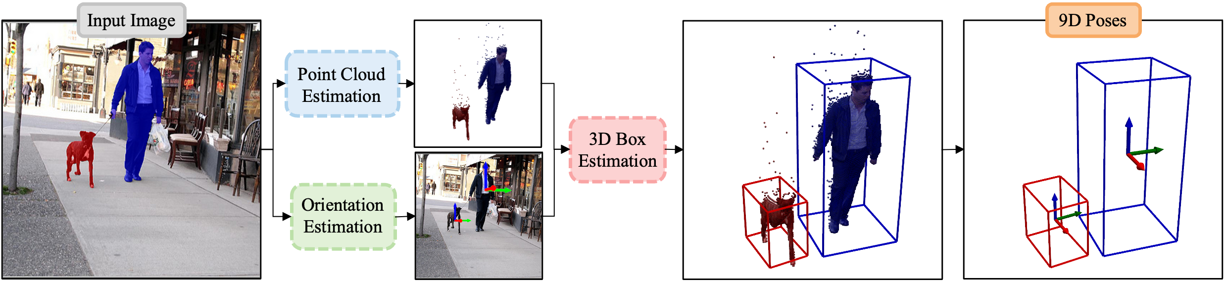 The pipeline takes a 2D image and masks as input and simultaneously estimates both the 3D point clouds and the orientation for the objects. Next, this information is used to fit oriented bounding boxes for each object. Finally, this process outputs the 9D poses, which define the precise location, size, and orientation of each object in 3D space.